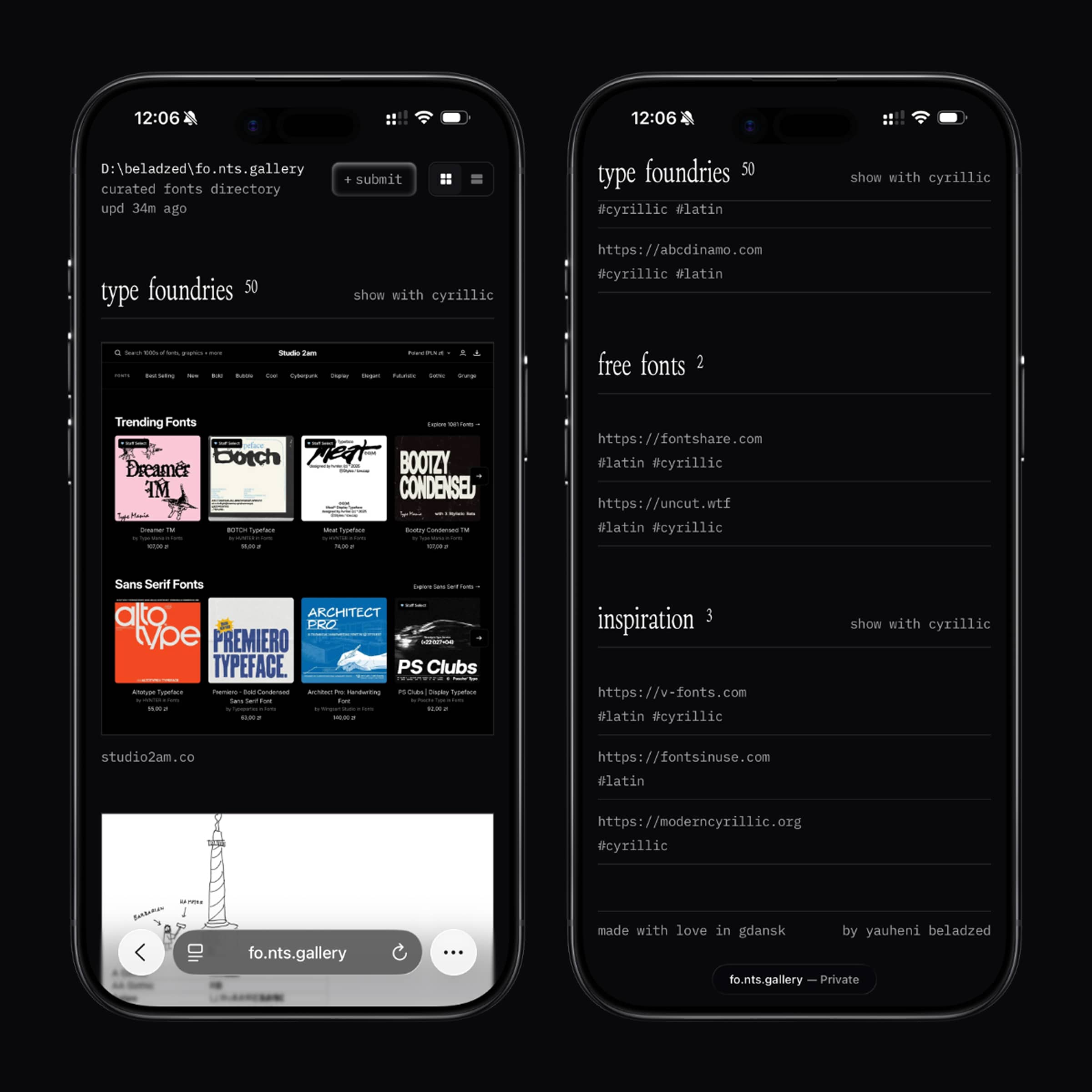 После стало интересно попробовать что-то большее и я собрал курируемый каталог ссылок на классные шрифтовые студии. Там уже все по-взрослому: реакт, гит, сервер, базы данных и другие страшные дизайнерам слова. Отдельный кайф, что я сделал к этому расширение, которое в один клик сохраняет нужный сайт в нужную категорию.