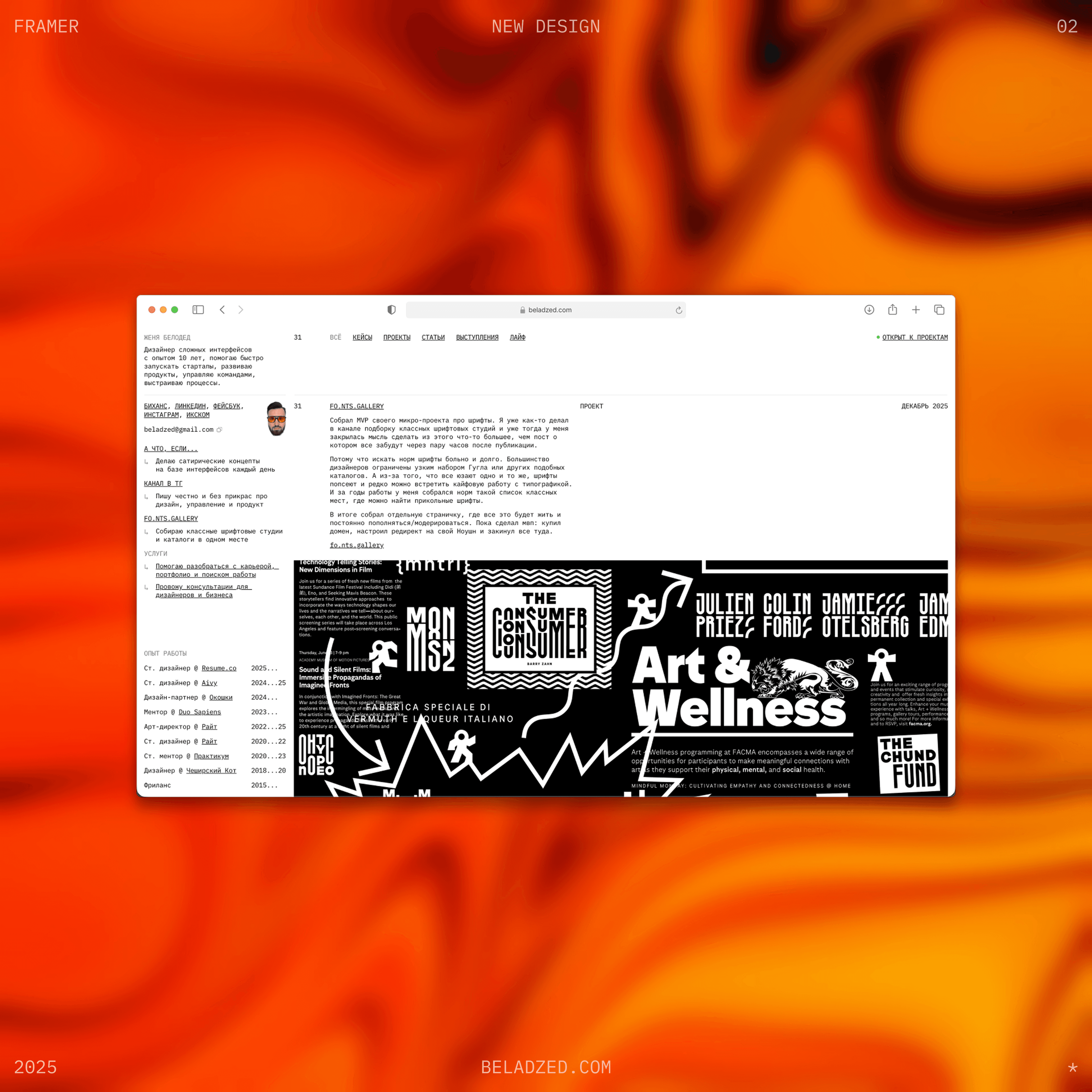 Последним по списку, но не по значимости, отмечу переезд с Вебфло на Фреймер на личном сайте. Мне было интересно потыкать новый для себя инструмент, опять же, на реальной задаче и по пути освежить дизайн, который начал меня напрягать. Получилось, как мне кажется, круто, даже несмотря на то, что впереди еще много работы по всяким мелочам.