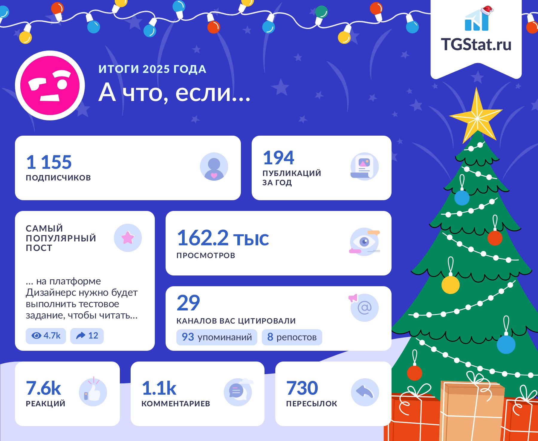 Год кайфовый. Много новых знакомств, идей, проектов, планов. Главный вывод года — классные люди важнее любого материального. Естественно, что-то не получалось, но я к этому абсолютно норм, не все ж будет так, как я запланировал. На следующий год большущие планы, но об этом будет в моих каналах и следующих итогах. Спасибо, что читаете, всех обнял ❤️