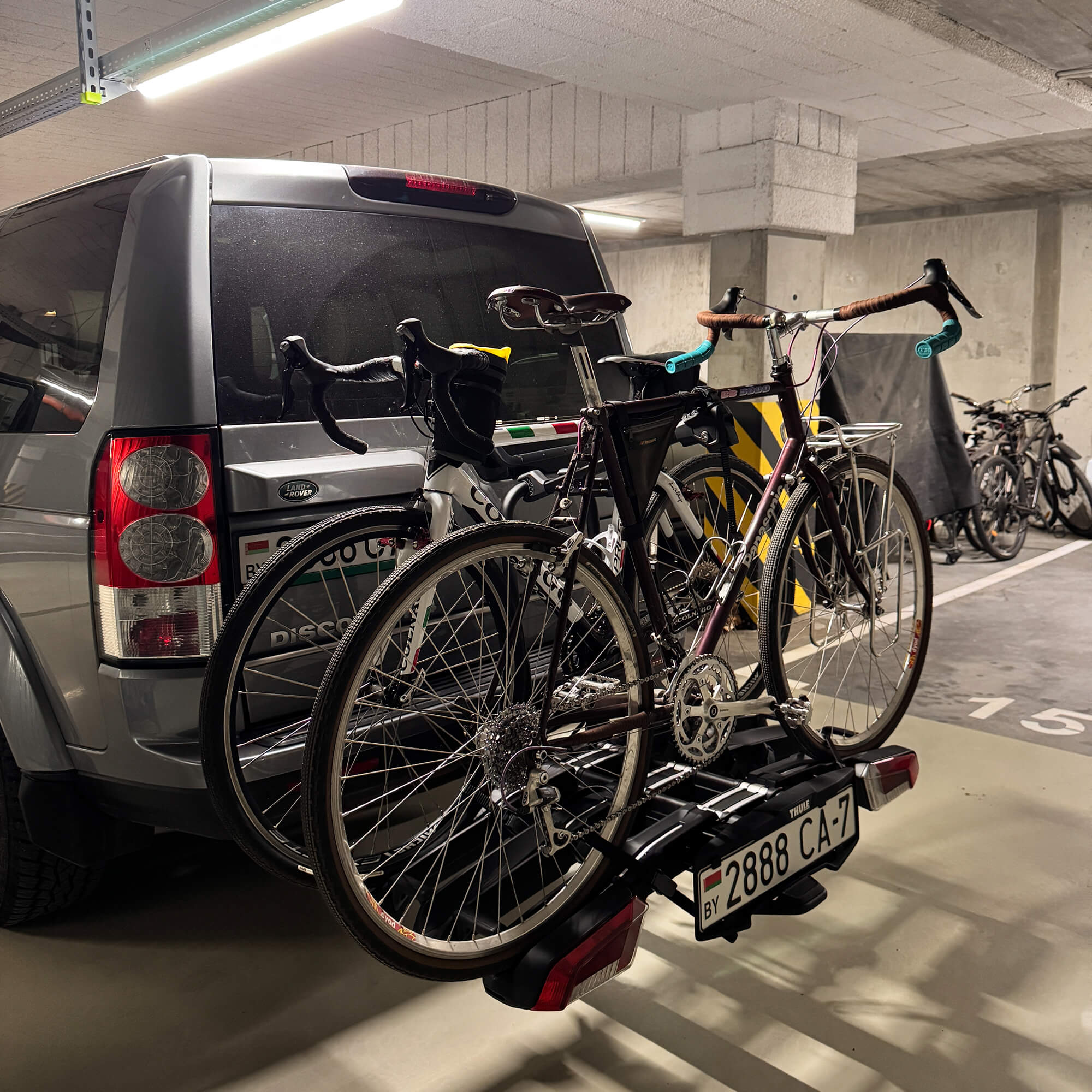 Теперь у нас появился велобагажник, который ставится на фаркоп и это оказалось супер удобно. Можно в одного человека закинуть 3 велосипеда и поехать куда глаза глядят. Не нужно париться за разборку, грязные колеса и все такое, просто застегнул и поехал куда глаза глядят. Для этого, правда, пришлось доустановить фаркоп вместе с розеткой, но оно того стоило.