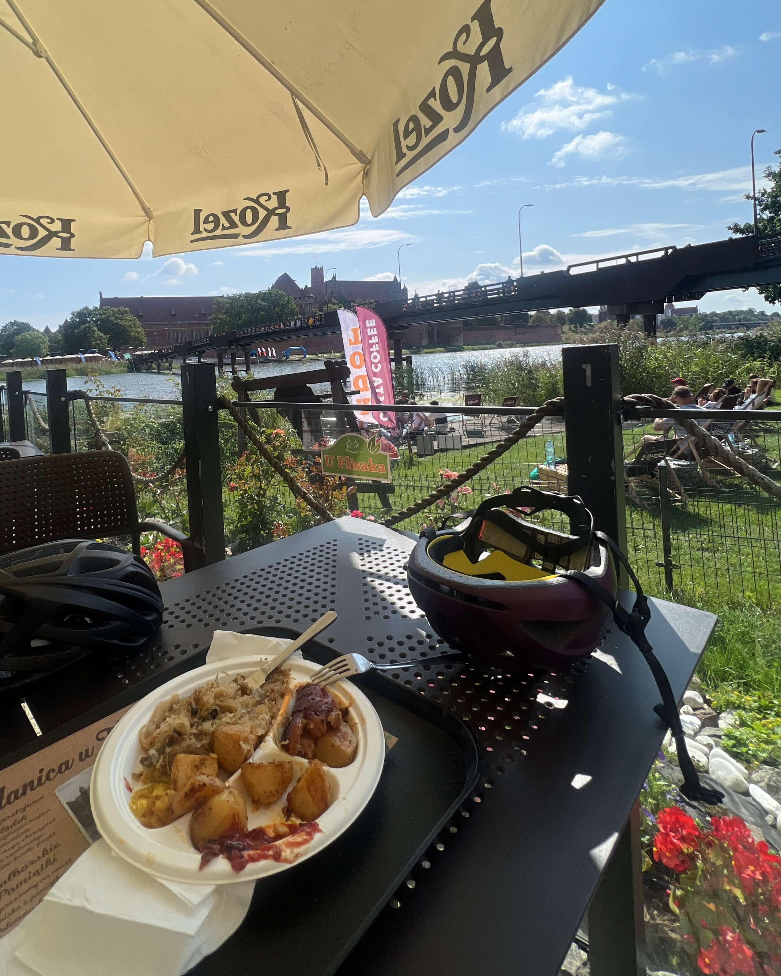 Завтракали с видом на соревнования через реку от замка. Я заказал типичный польский набор: бигос, рульку и жареную картошку.