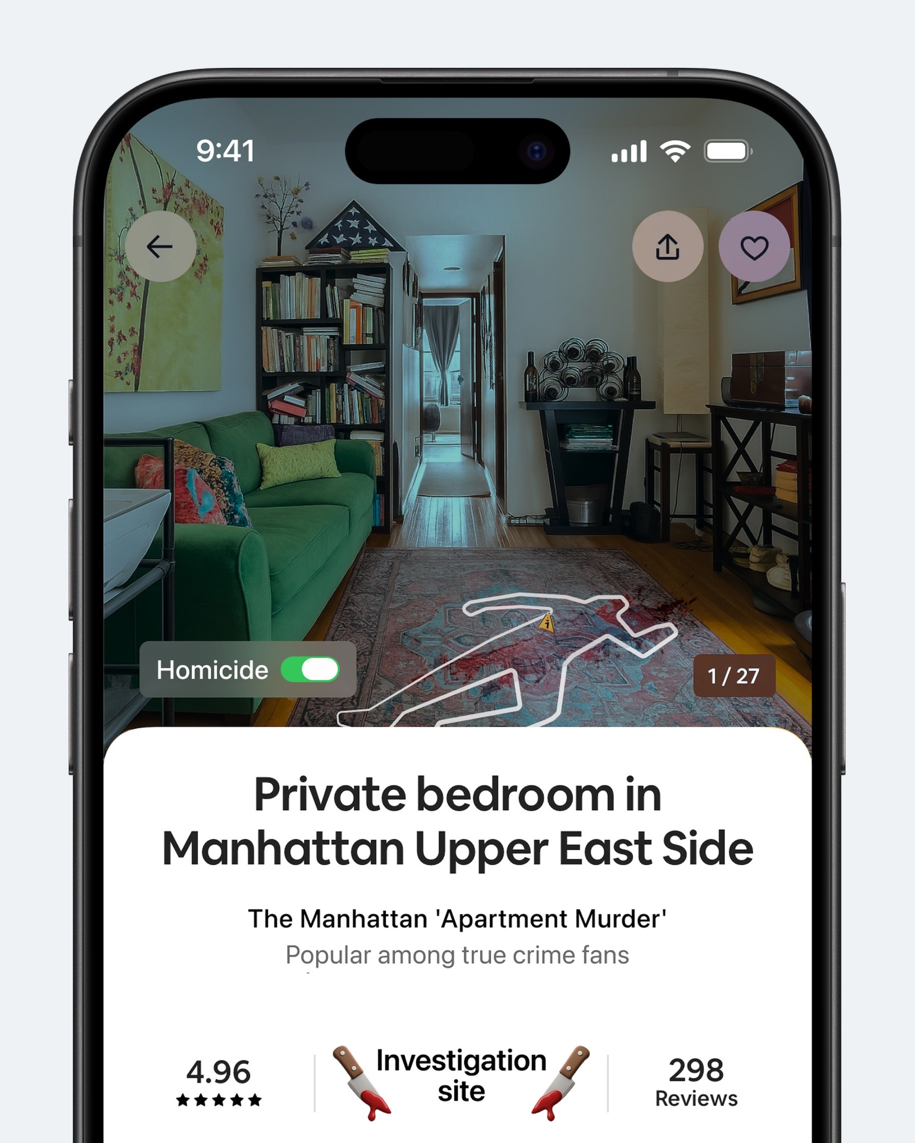 Кажется, Airbnb нужно пойти дальше и помечать особенно интересные квартиры. Например, те, где произошли какие-то громкие убийства. Это можно было бы использовать как конкурентное преимущество квартиры и сдавать ее дороже любителям тру-крайма. Ну, или просто любителям темных историй.