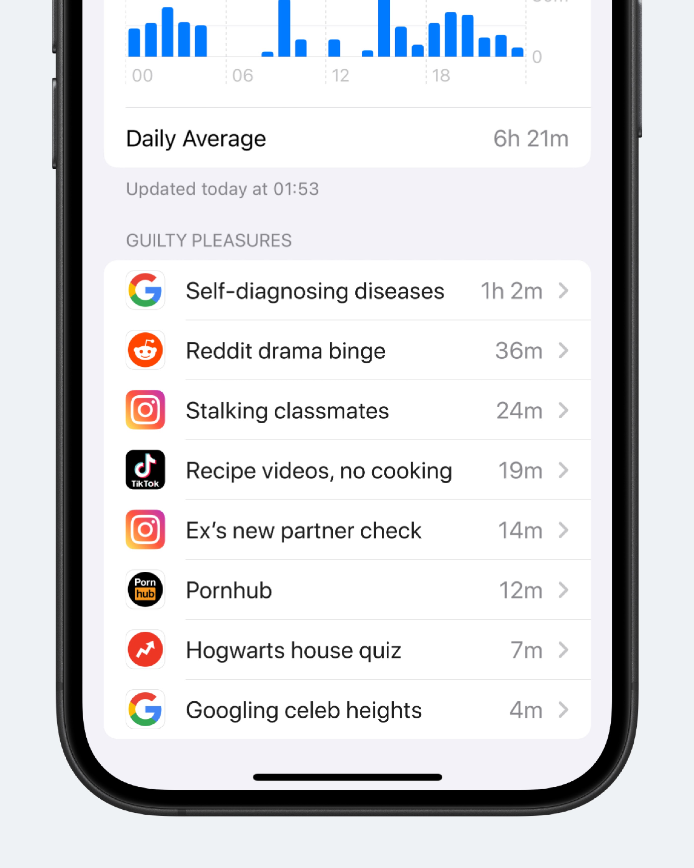 Я думаю вы знаете, что в настройках Айфона есть раздел экранного времени, где видно распределение экранного времени по приложениям. Мне показалось, что это недостаточно информативно и стоит показывать больше. В том числе ваши самые тайные удовольствия.