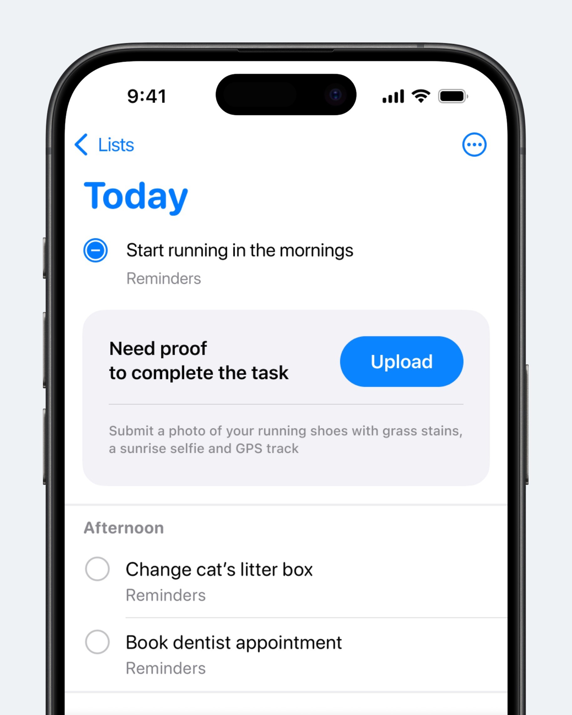 Мне кажется, было бы правильным запрашивать пруф при каждой попытке «выполнить» дело в туду листе. Бездельников вроде меня станет меньше, ведь придется и правда что-то делать, а не просто отмечать. Возможно, так Эпл даст пинок миллионам людей изменить свои жизни)