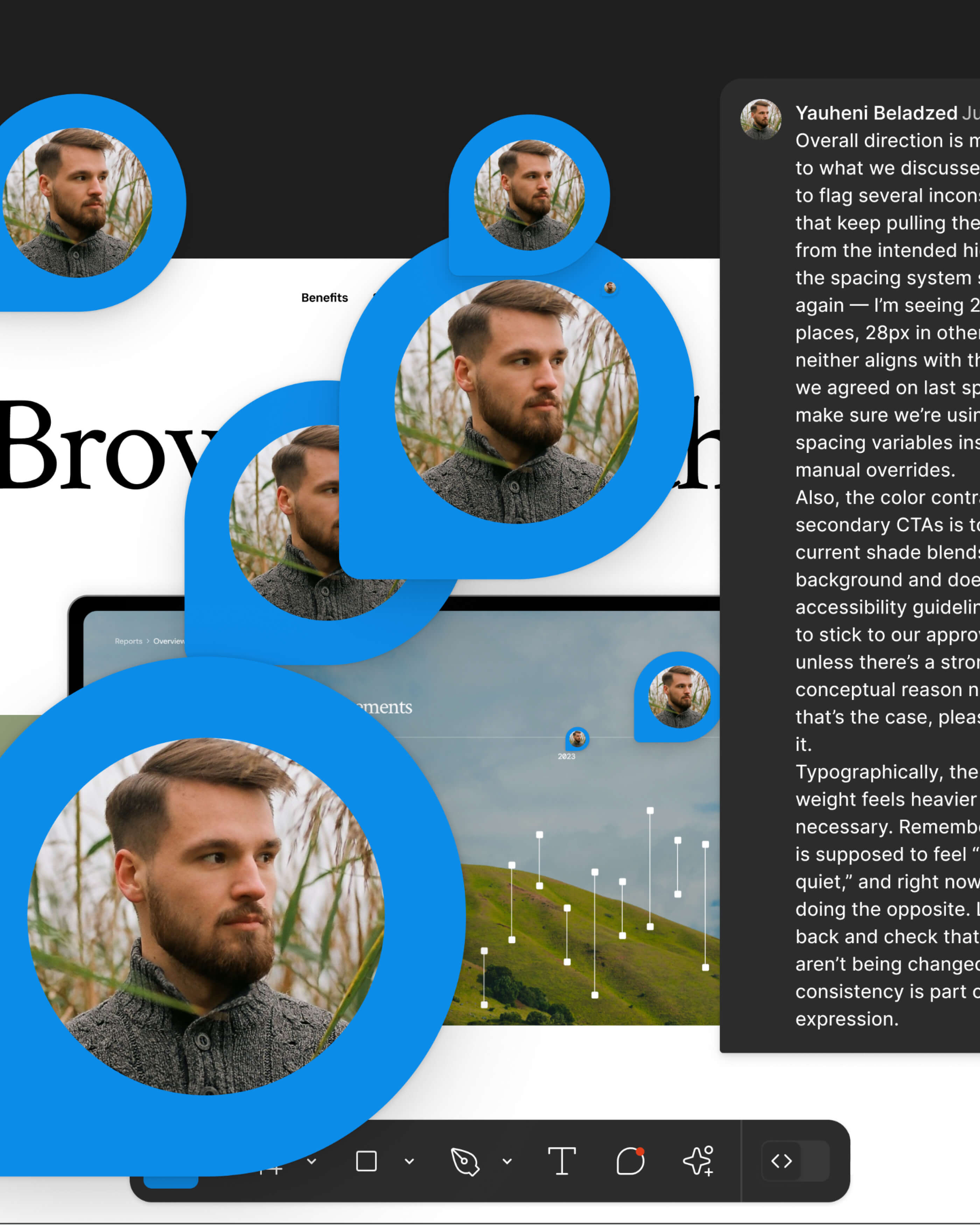 А что, если… заметность комментариев в Фигме будет напрямую зависеть от количества текста внутри? То есть чем больше текста, тем заметнее комент на холсте. Так дизайнеры точно будут идти по приоритетам и будут меньше терять ключевые коменты. Ведь если уж клиент или арт-дир написал много текста, значит на это точно нужно обратить внимание, ведь так?)