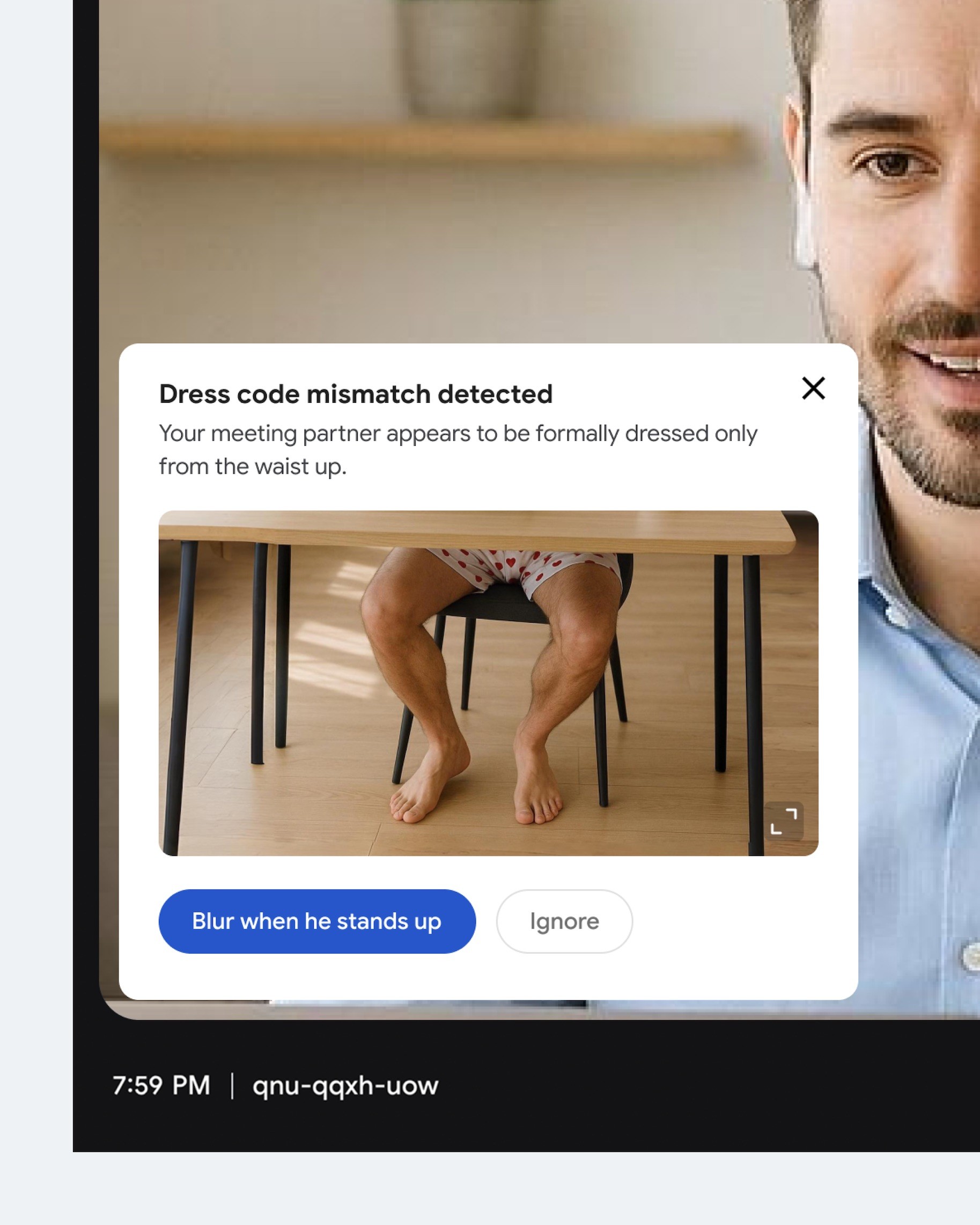 Думаю, Гуглу надо с этим бороться и уведомлять, если собеседник сидит в трусах. А чтобы избежать «показа лишнего», встроенный AI может блюрить все, что ниже пояса.