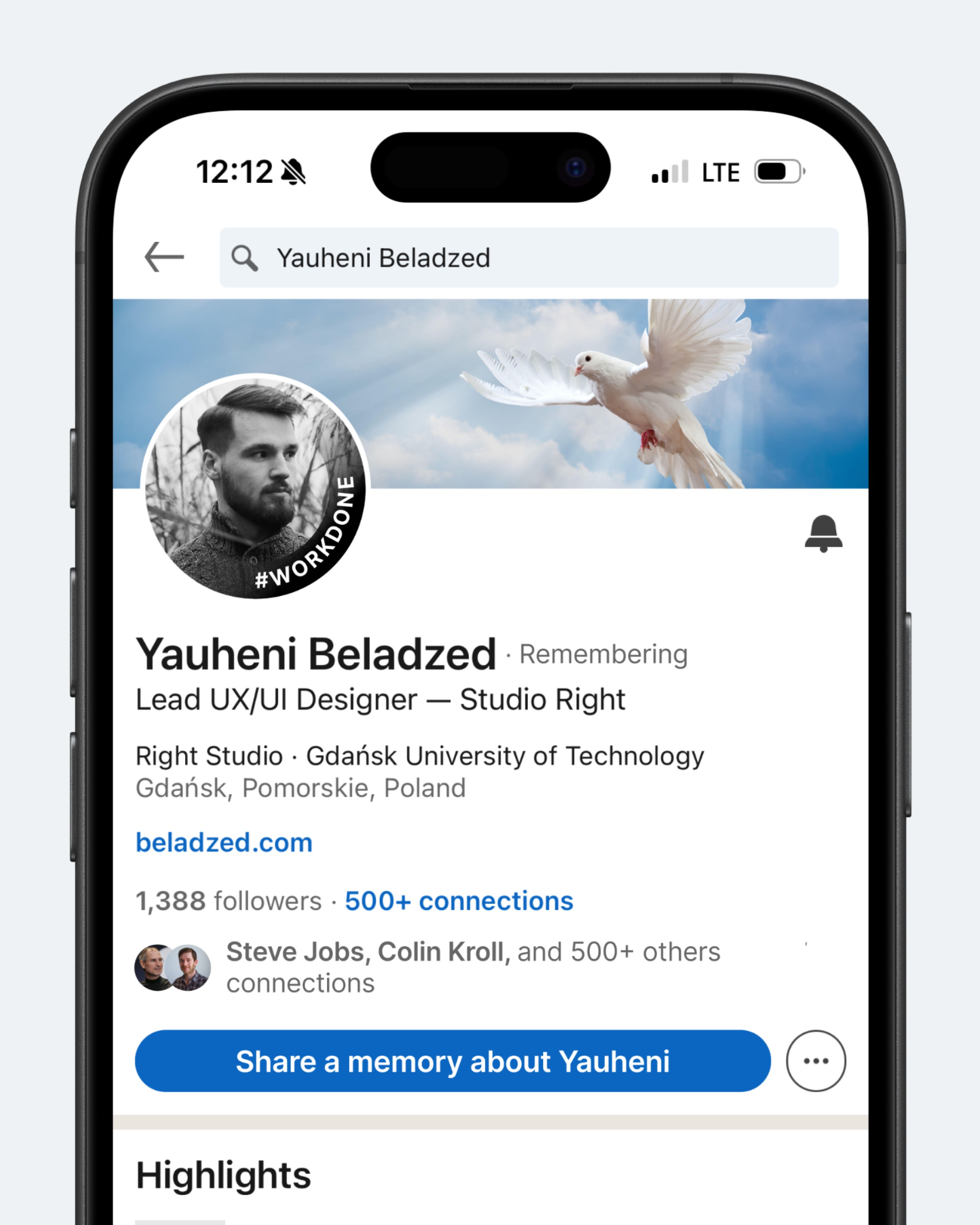Мне показалось LinkedIn отлично подходит для внедрения такой механики, ведь там уже есть ленты «Open to work», которые максимально похожи на ленты на фотографиях умерших.