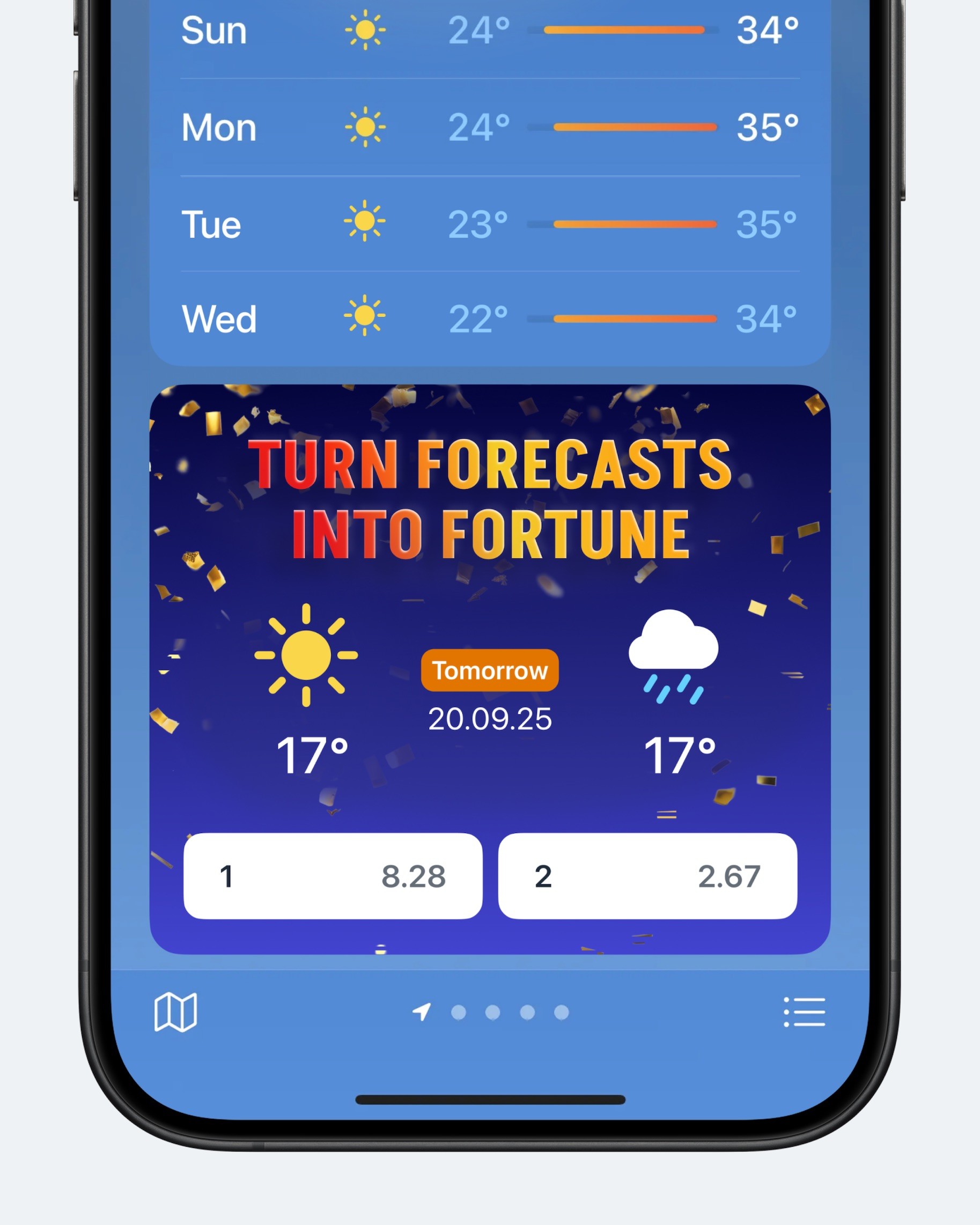 Мне кажется Эплу пора это монетизировать и начать принимать ставки на фактическую погоду в определенную дату. Так и денег больше заработают, и людям в наших широтах будет хоть какой-то смысл заходить в это бесполезное приложение.
