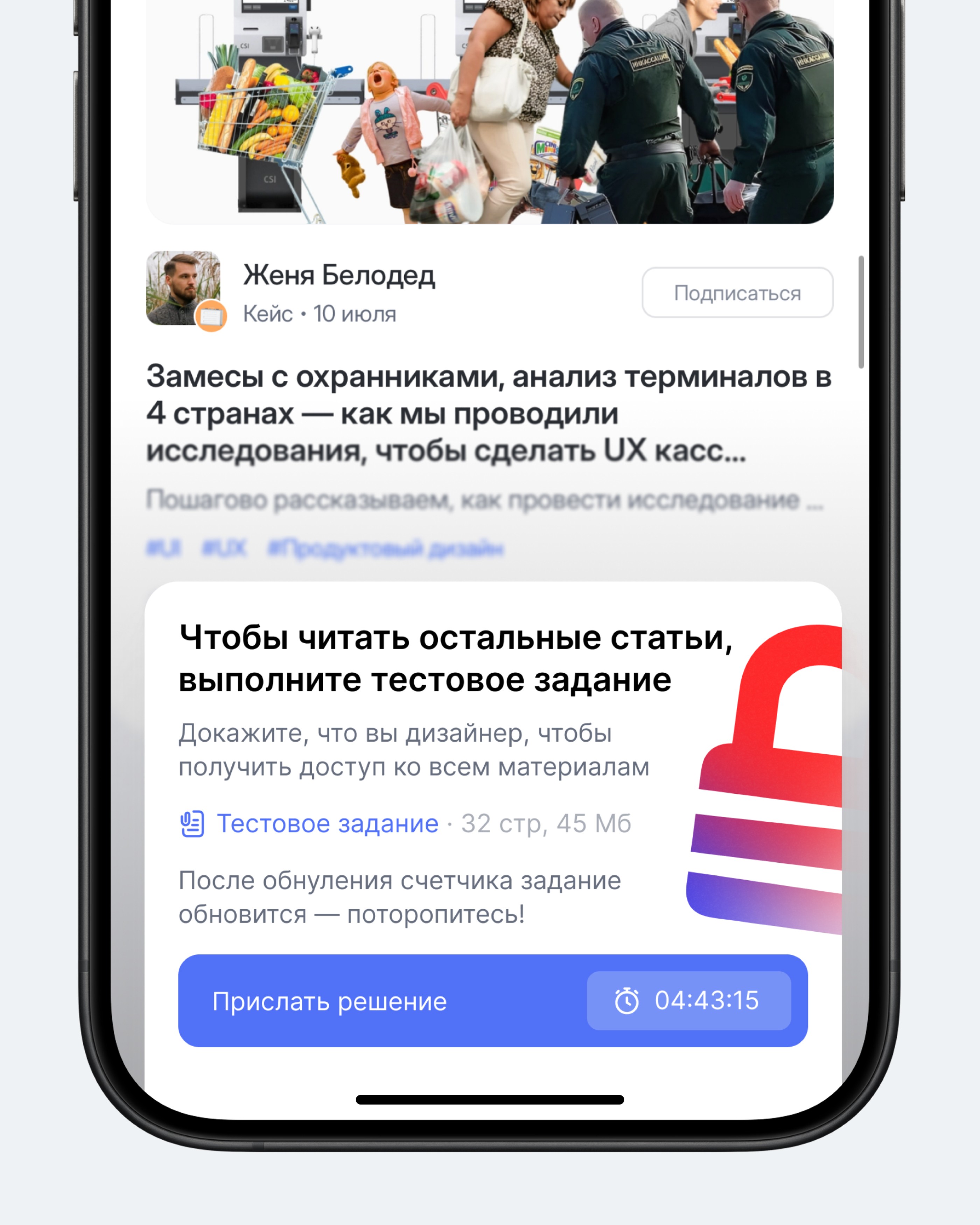 Я подумал, что их платформа слишком выделяется свободой на фоне конкурентов и накинул идею, которая поможет отобрать только самых мотивированных читателей. Предлагаю после скролла в пару экранов, блокировать контент попапом, где нужно будет решить тестовое задание, чтобы читать остальные материалы. А для проверки самостоятельности выполнения, каждые 6ч задание будет автоматически меняться.