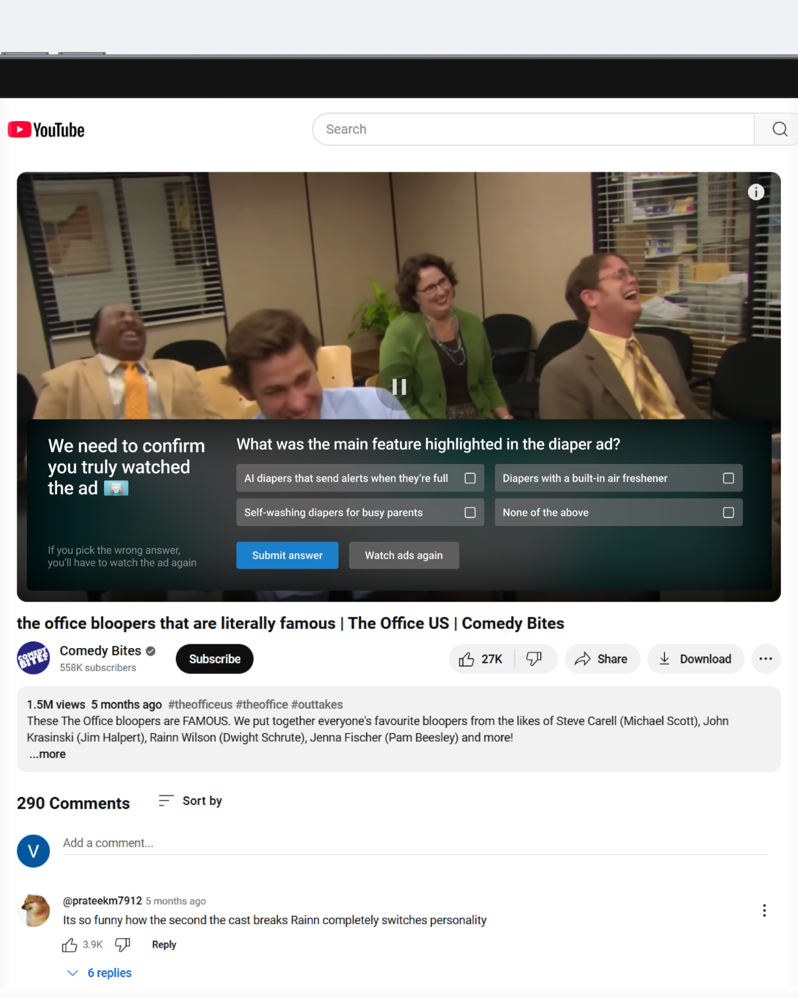 Я думаю YouTube должен пойти дальше: убрать возможность пропускать рекламу, а после просмотра рекламного видео проводить тестирование, чтобы убедиться, что пользователь внимательно все посмотрел. При этом, не давать возможность продолжить смотреть видео, пока не будет получен правильный ответ с первой попытки. Если дал неправильный ответ — смотри рекламу заново.