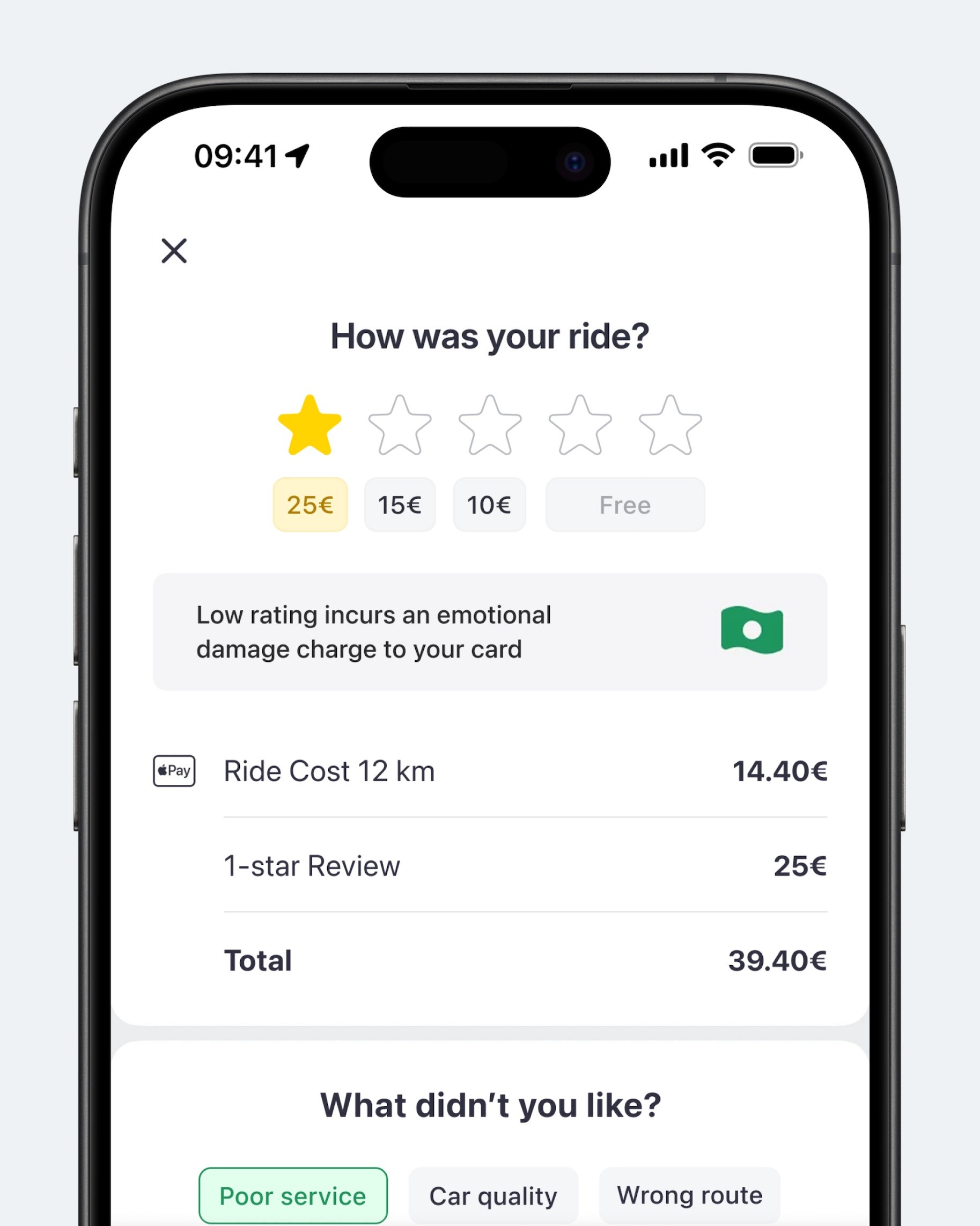 А если поездка настолько не понравилась пользователю, что он готов заплатить, точно надо делать зависимость от количества звезд. Чем ниже, тем дороже, чтобы денежка на счет капала, в обмен на испорченные цифры перед инвесторами)