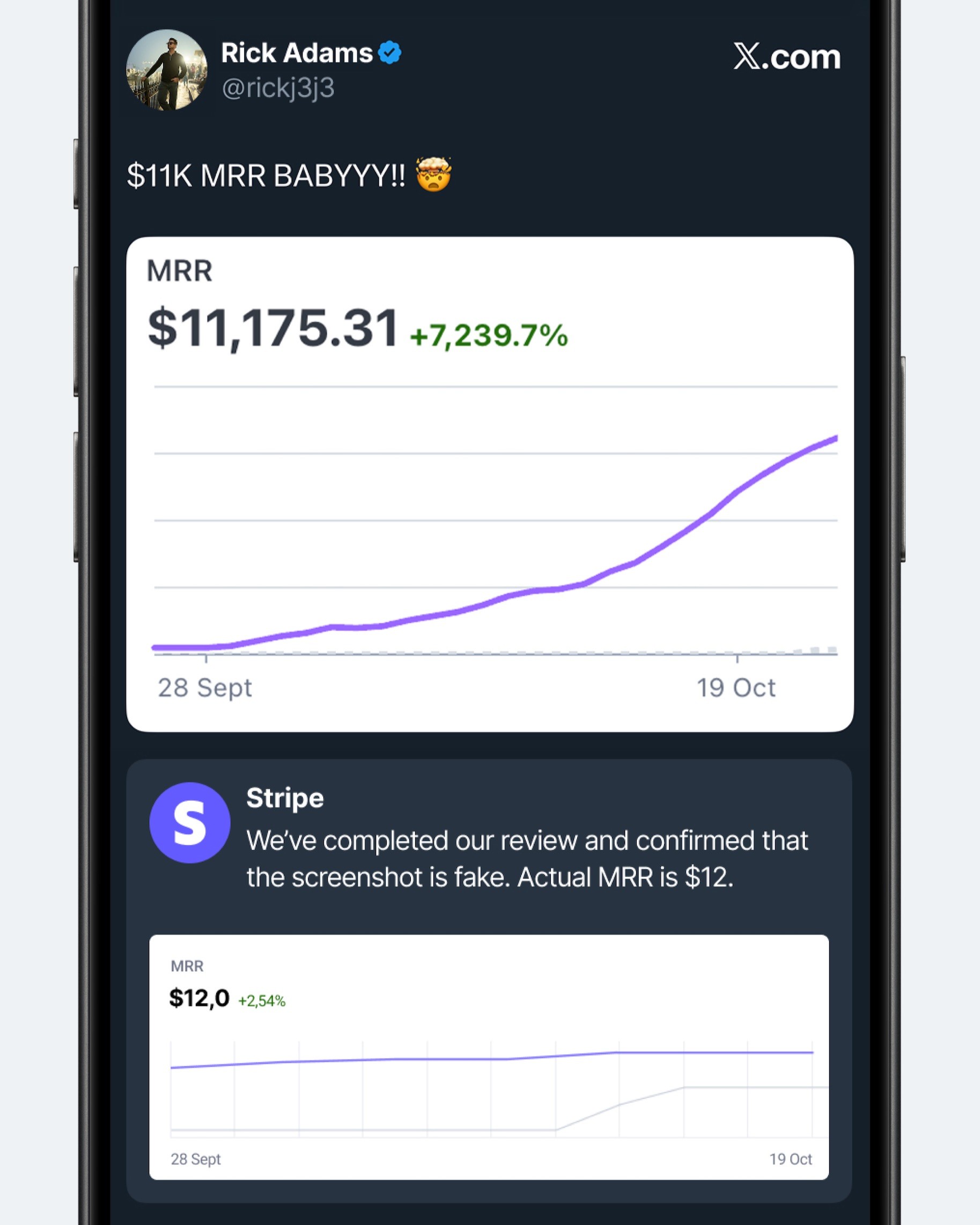 Думаю платежкам вроде Страйпа пора начать говорить правду. Только представьте, запостил фейковый MRR, а тут оп, а Страйп автоматом подтянул настоящий, да еще и публично. Интернет станет чуточку честнее, а люди начнут меньше ощущать FOMO. Все будут счастливы)