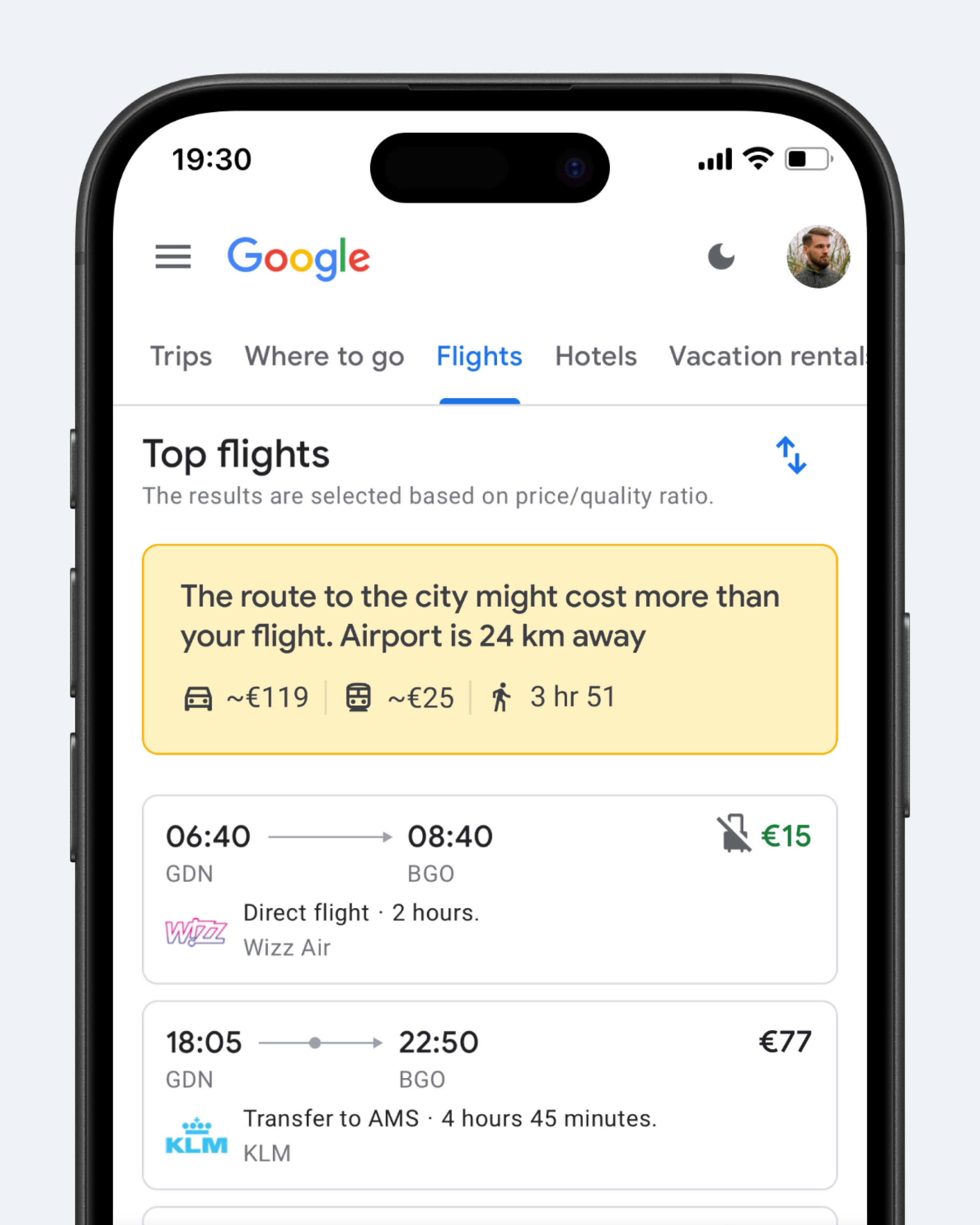 … теперь будет показываться полная стоимость «дешевых» авиабилетов вместе с дорогой из аэропорта до города в Google Flights?