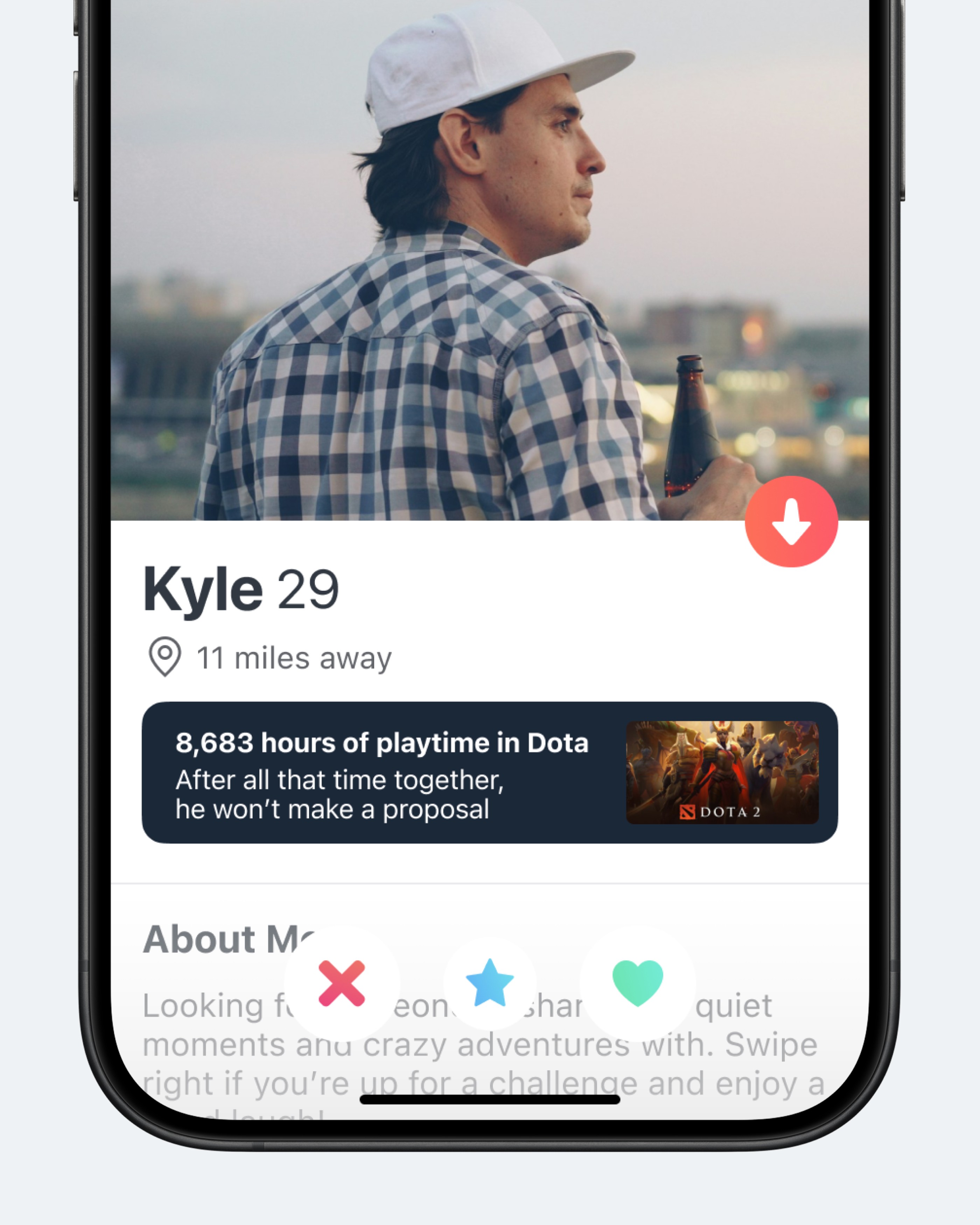 Я думаю дейтингам надо показывать виджет с количеством часов в играх, если число там больше 1000ч+. Это может стать предупреждением или наоборот поводом для метчинга.