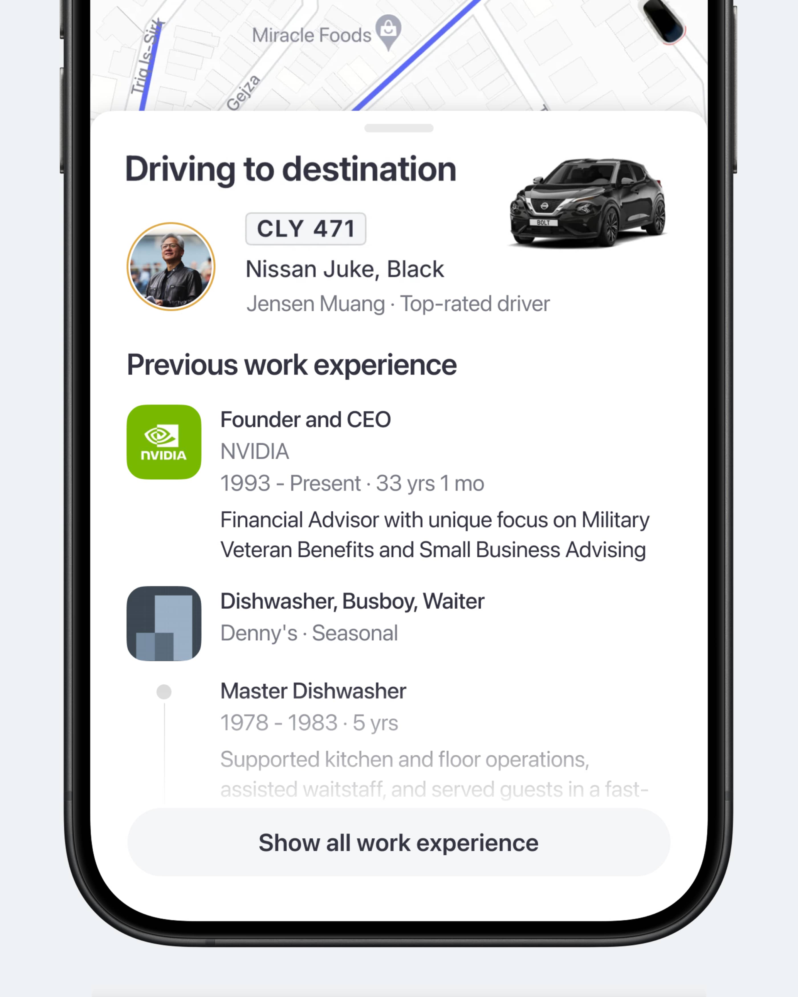 Я думаю сервисам такси надо подтягивать резюме водителя и показывать предыдущие и текущие места работы, как в Линкедине. Только представьте, сколько новых тем это откроет во время поездки…