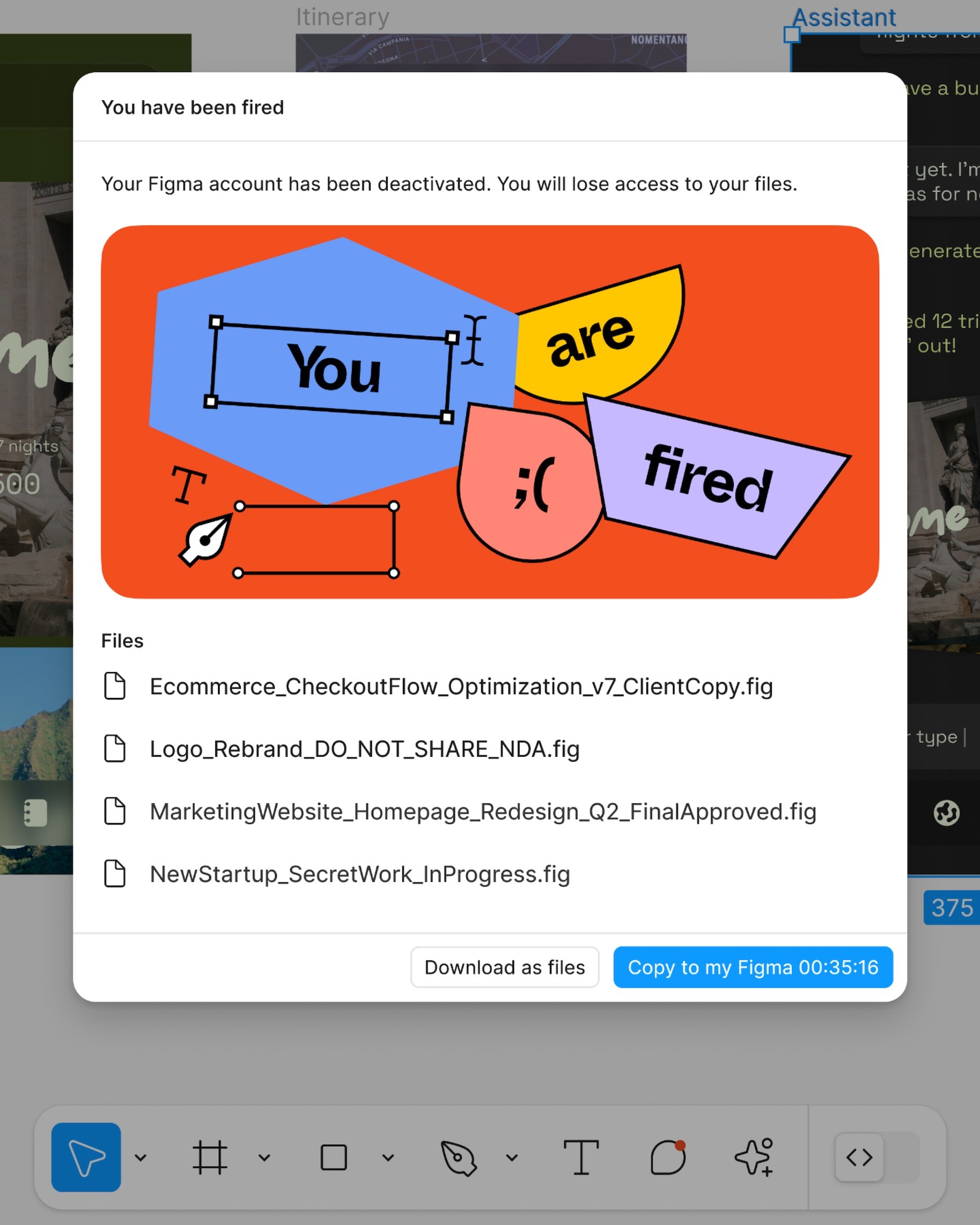 Я думаю Фигме надо предусмотреть такой юзкейс и кроме милой корпоративной иллюстрации давать список файлов, которые можно скачать одной кнопкой. Понятное дело с ограничением по времени, чтобы быстрые пользовались, а медленные не могли найти работу.