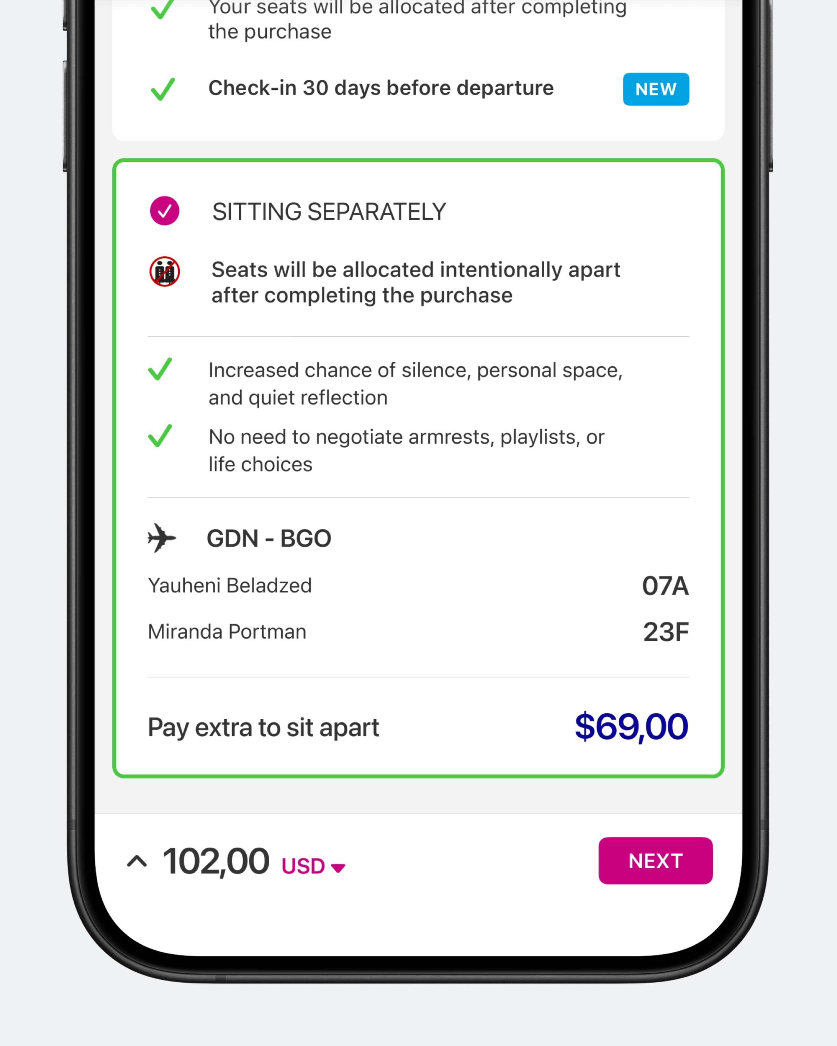 В общем одни плюсы, не понимаю, почему авиакомпании предлагают за доп деньги сидеть вместе при заказе двух билетов. Мне кажется, нужно делать ровно наоборот и продавать возможность сидеть раздельно. Особенно круто сработает на людей, которые 20+ лет в браке, думаю это принесет больше денег, чем дрочить людей за багаж…